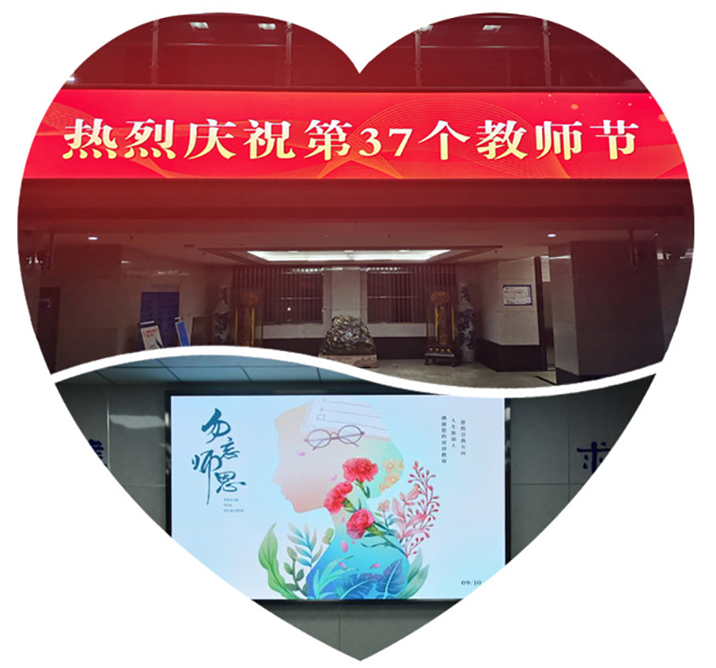 一盏盏灯,次第为您点亮;一块块LED屏,滚动播出“教师节快乐”“老师您好”字幕;电视、各种电子海报,洋溢着对全体教师的节日祝福,连英俊帅气的门卫小伙,也佩戴着“教师节快乐”“老师您辛苦了”大红绶带,营造了浓厚的节日氛围……