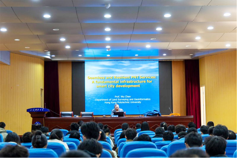 会谈后,陈武教授受邀为测绘与空间信息学院师生作题为“Seamless and Resilient PNT Services: A fundamental infrastructure for smart city development”的学术报告。他围绕PNT技术的种类、服务,以及在智慧城市建设中的挑战等方面进行报告。(通讯员:孙金香 摄影:吴静 陈硕浩 责编:信永华)