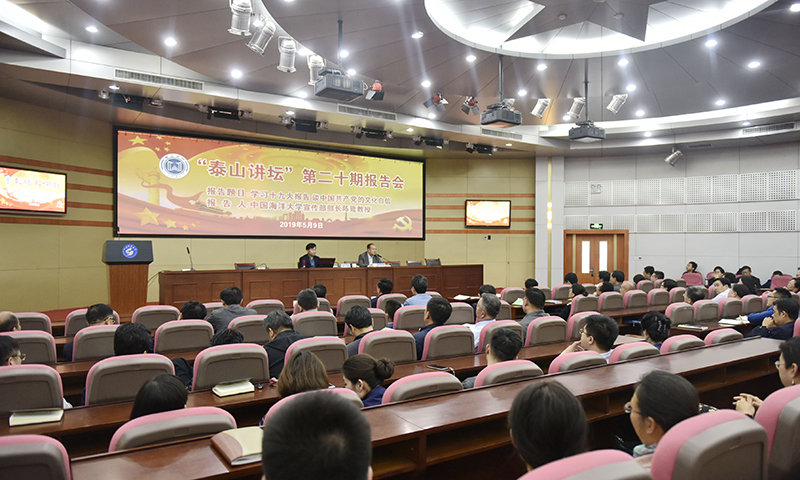5月9日,中国海洋大学宣传部部长陈鷟教授应邀做客“泰山讲坛”, 以“学习十九大报告,谈中国共产党的文化自信”为题,围绕党的十九大对文化自信的阐述,从对中国传统文化的剖析入手,结合大量历史和现实实例,对如何“坚定文化自信,推动社会主义文化繁荣兴盛”进行了深度解读。