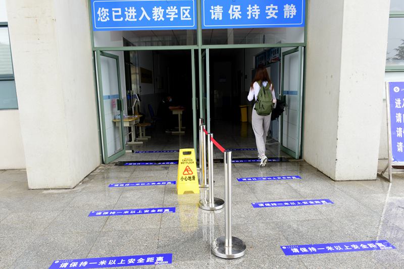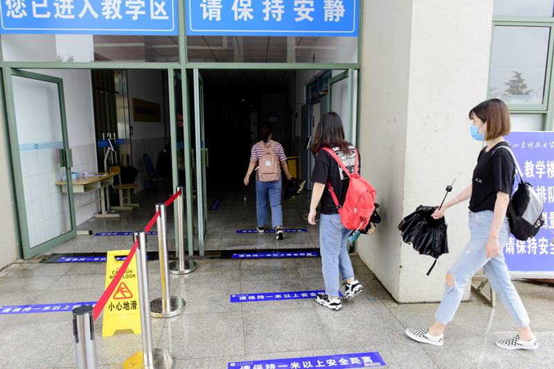 按照疫情防控要求,同学们进教学楼上课时,要进行体温检测,体温正常的同学才允许进入教学楼。在教室上课时,座位之间需要保持一米以上的安全间距,每间教室都按照要求在座位上贴上了座位贴,上课时按照座位贴在教室里就座。